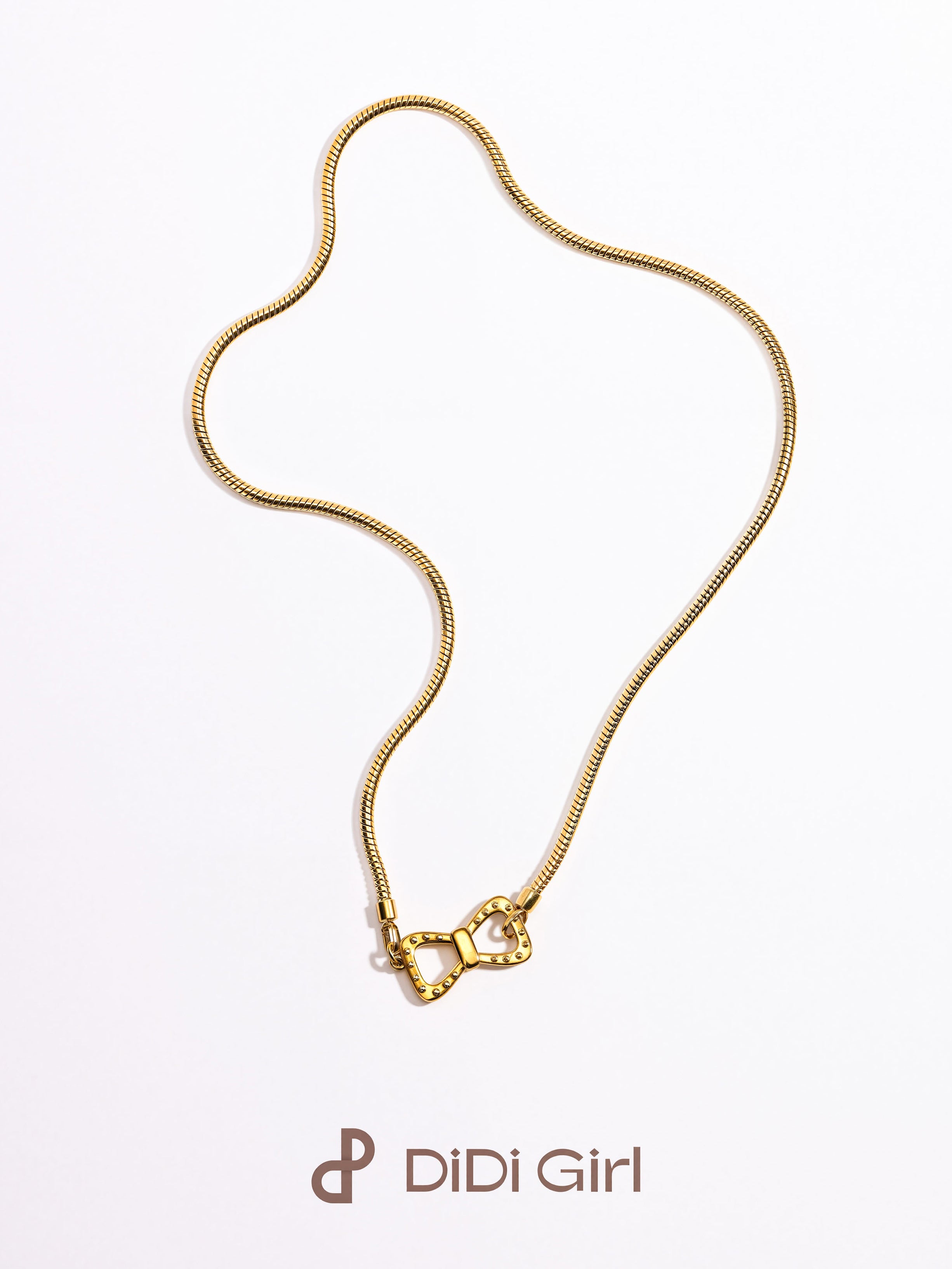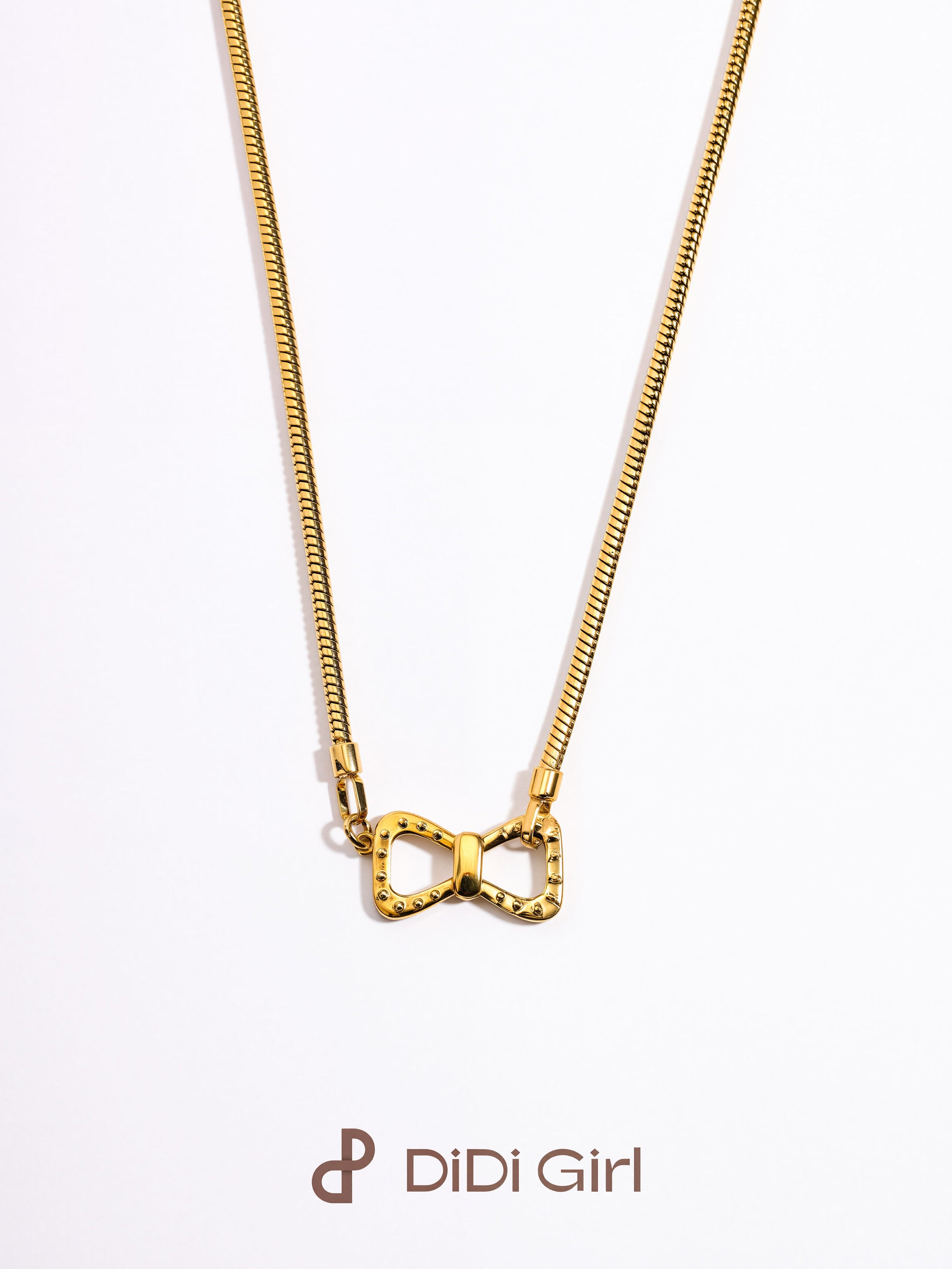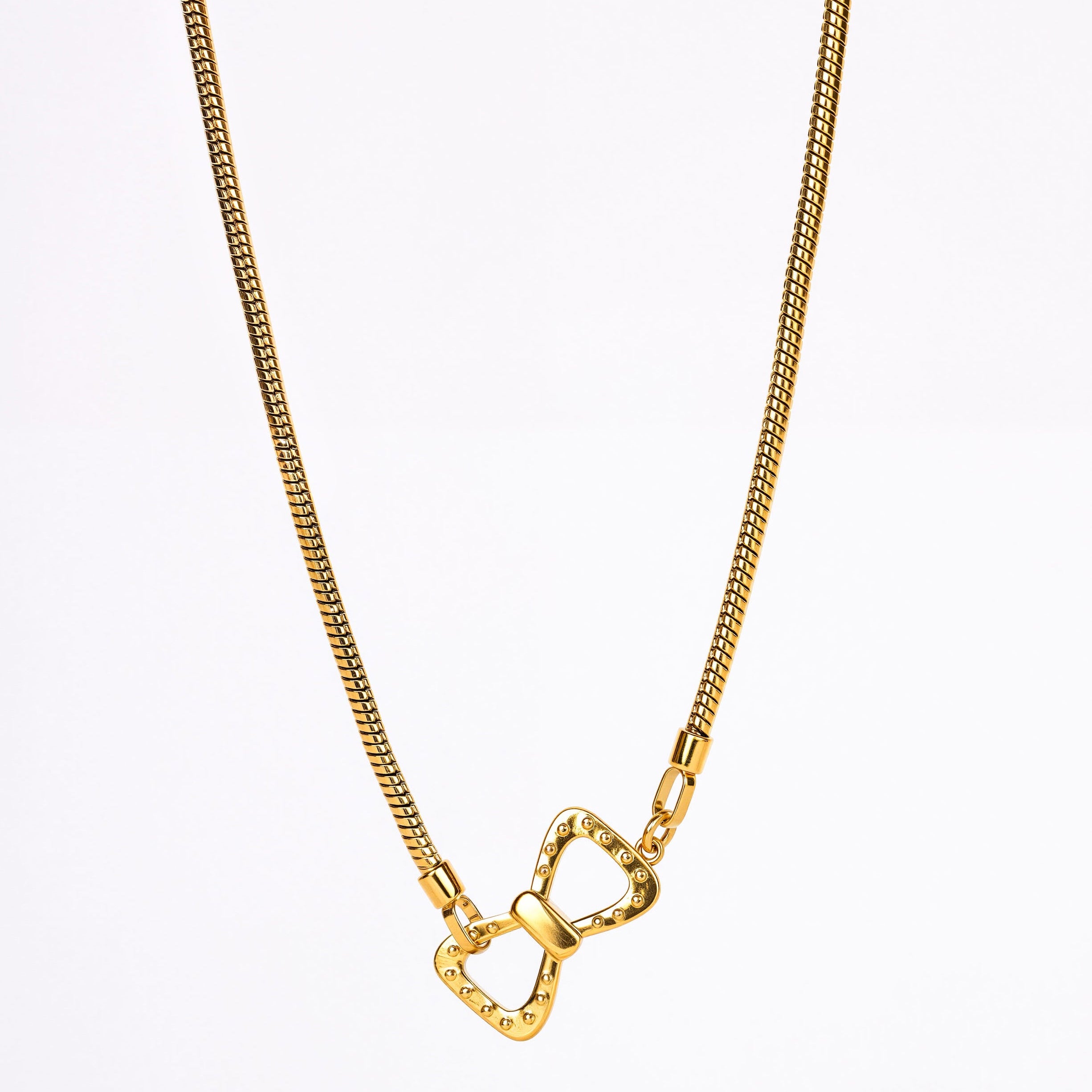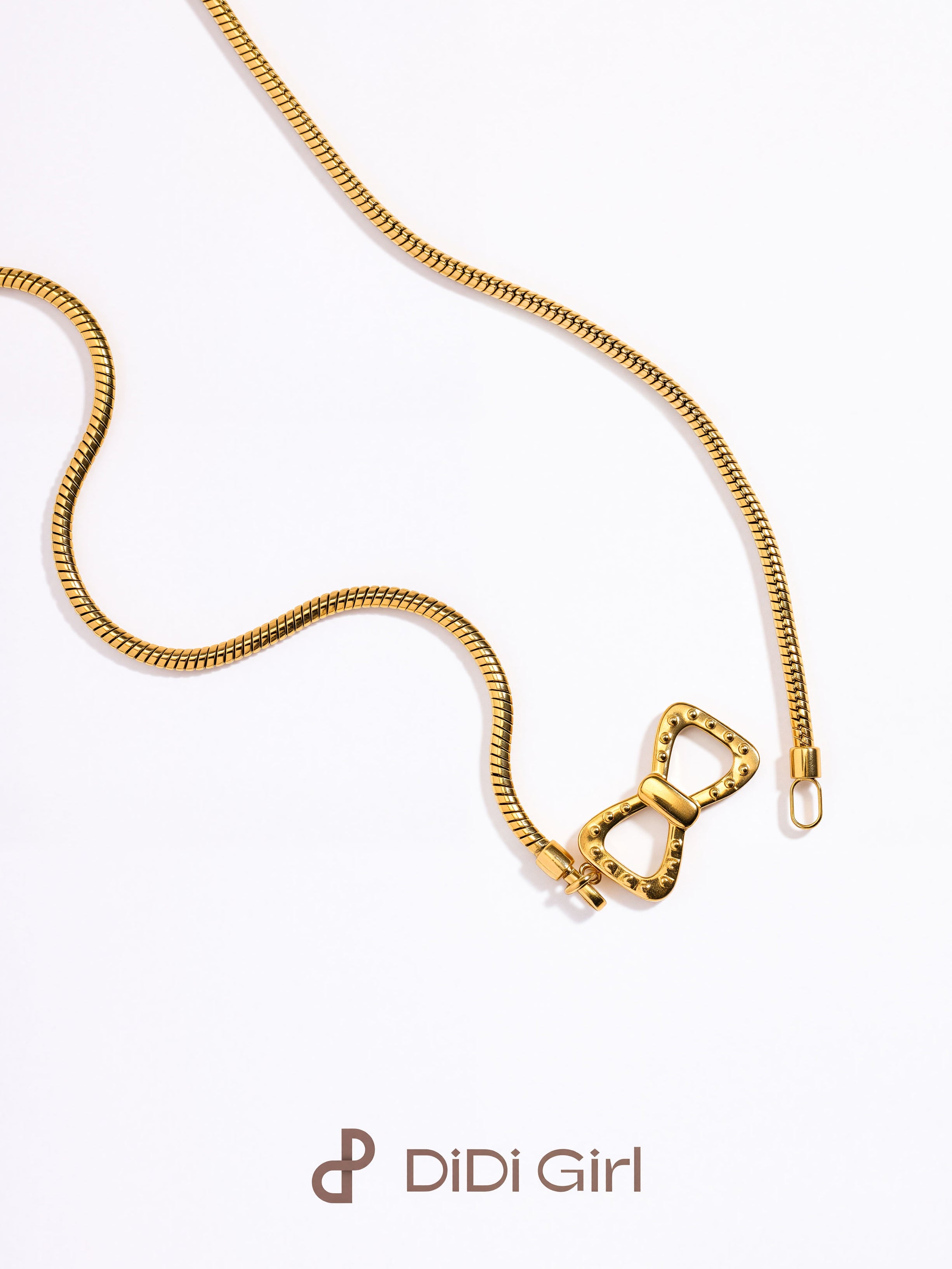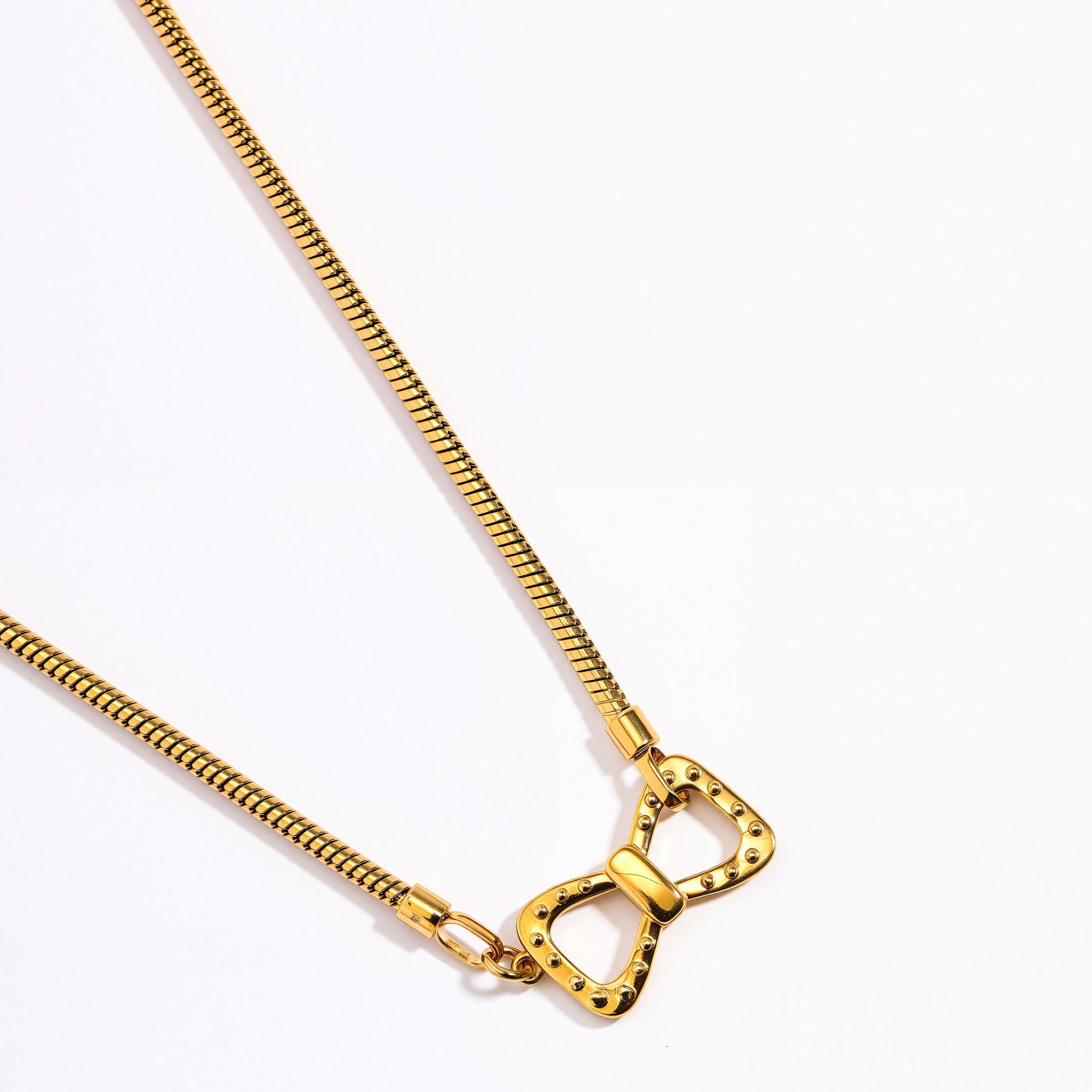Elevate your style with our exquisite Geometric Bow Necklace. This charming piece features a beautifully crafted geometric bow design, symbolizing elegance and playfulness. Made with a high-quality snake chain and finished with vacuum 18K gold plating, this necklace radiates sophistication and charm. The unique geometric shape of the bow adds a modern twist to a classic motif, making it perfect for any occasion. Ideal for layering or wearing alone, this necklace is a thoughtful gift for yourself or a loved one. Celebrate your unique style with this stunning accessory that complements any outfit.