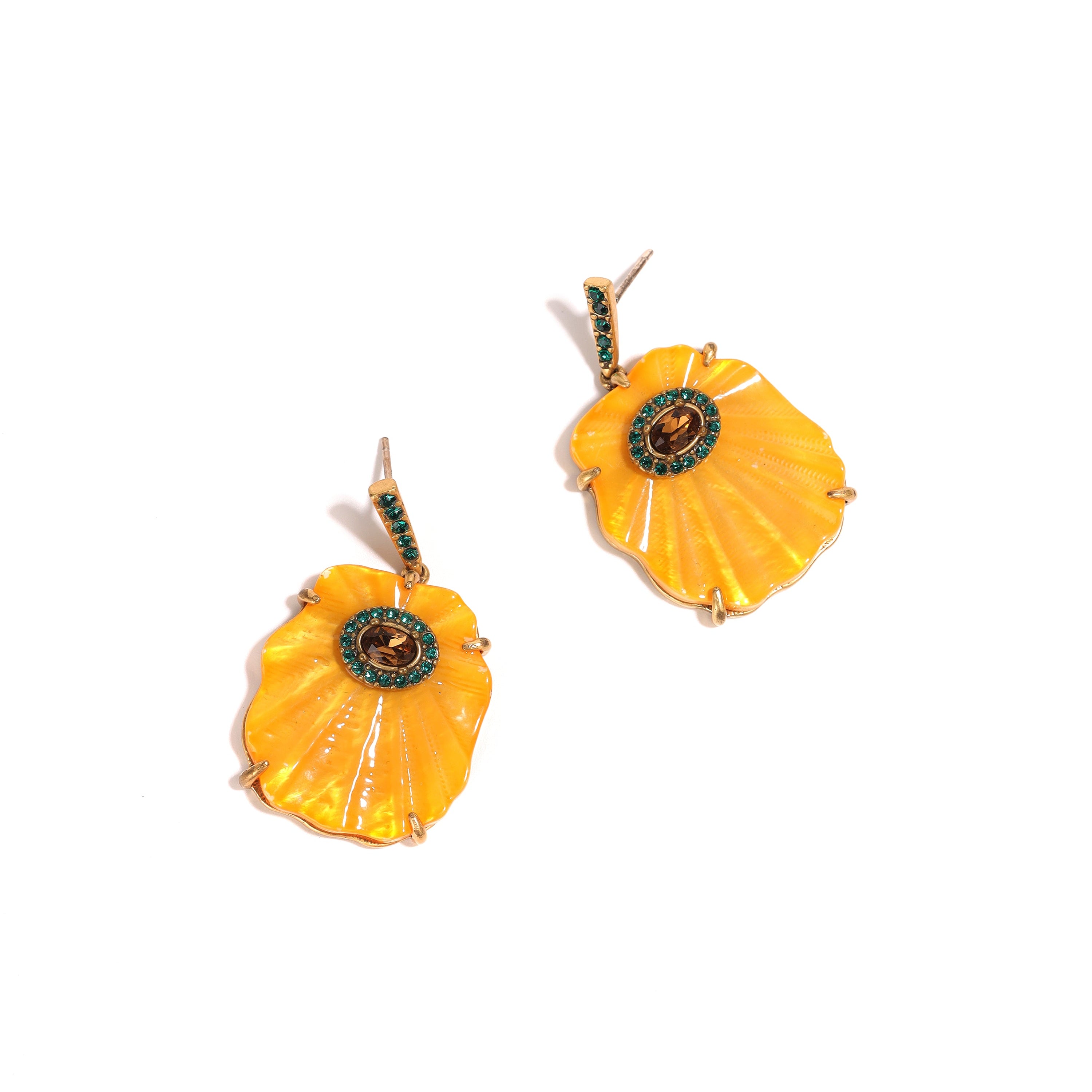 Elevate your outfit with these Vibrant Orange Shell and Crystal Earrings, a perfect blend of unique design and luxurious embellishments that will make you stand out.